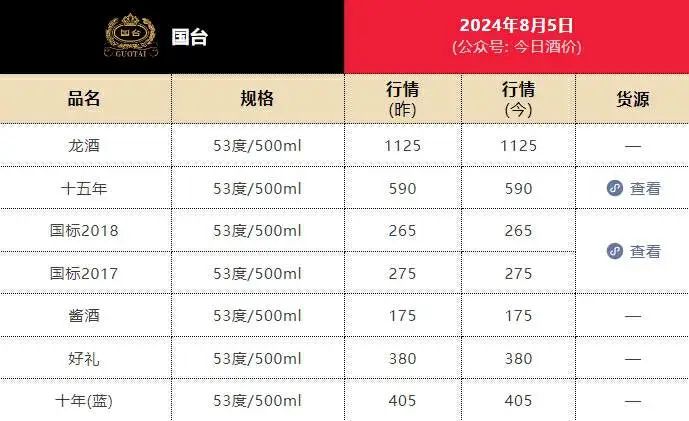 据“今日酒价”公众号显示,8月5日国台国标酒(2018)批价在265元/瓶,国台十五年为590元/瓶,国台龙酒为1125元/瓶。