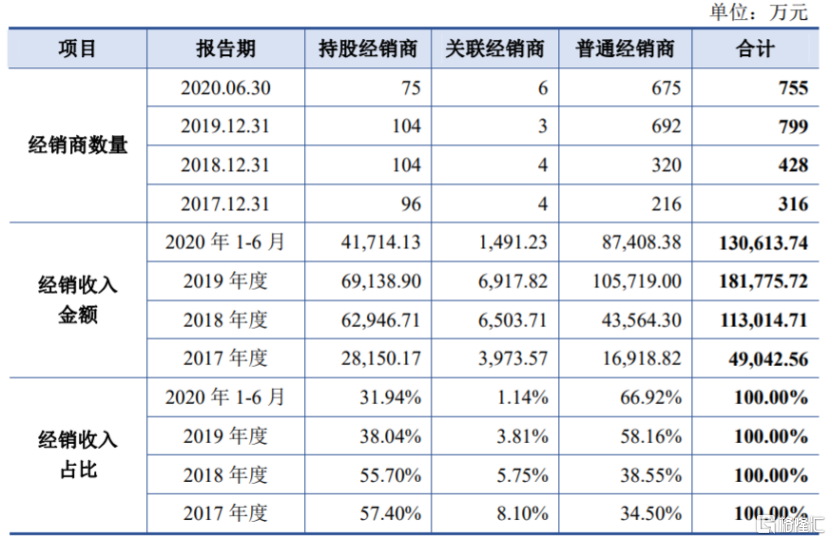 值得注意的是,2017年至2020年1-6月,国台酒业的持股经销商贡献的收入占公司当期经销收入的比例分别为57.40%、55.70%、38.04%、31.94%,尽管占比有所下降,但仍在30%以上。