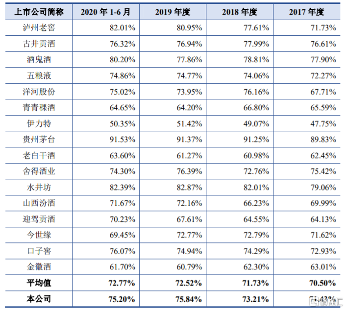 业绩方面,2017年至2020年1-6月,国台酒业的营业收入约5.73亿元、11.76亿元、18.88亿元、13.59亿元,对应的净利润分别约0.47亿元、2.4亿元、4.1亿元、2.45亿元,同期主营业务毛利率分别为71.43%、73.21%、75.84%、75.20%。