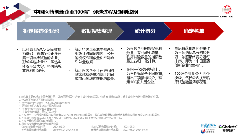 由E药经理人在科睿唯安Derwent Innovation?专利数据及Cortellis?竞争情报和临床试验数据基础上,基于“三维度四指标”评选体系,经历数月的数据筛选、整合分析后生成的“2024中国医药创新企业100强”(以下简称“创新100强”)重磅出炉。