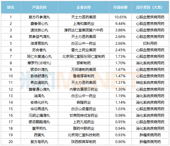 从治疗类别上看,20个中成药丸剂涉及5个疾病治疗领域,其中心脑血管疾病用药多达11个,消化系统疾病用药有5个,肿瘤疾病用药有2个,妇科用药、神经系统疾病用药各有一个品种上榜。