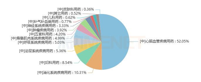 从治疗类别上看,心脑血管疾病用药是中成药丸剂市场的绝对销售主力,占据的市场份额高达52.05%,这得益于丸剂药效较持久,便于吸收、释药缓慢,适用于慢性病的治疗。此外,消化系统疾病用药占比10.31%,妇科用药占比8.54%,呼吸系统疾病用药、泌尿系统疾病用药占据的市场份额均超过5%。