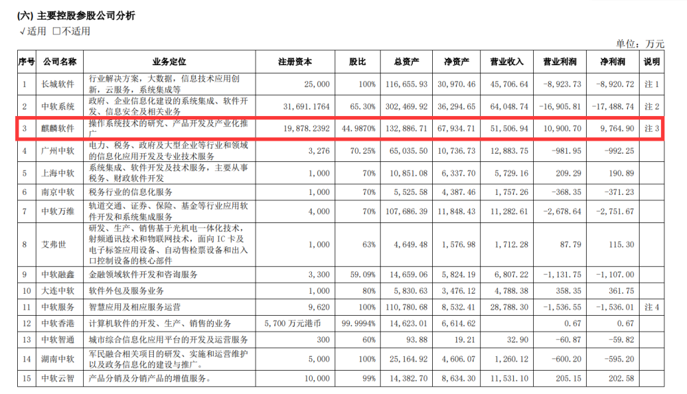 观察者网注意到,2021年上半年,在中国软件的参股公司中,大部分公司的净利润均为亏损,麒麟软件成为其中为数不多的亮点,该公司由中国软件持股44.987%。