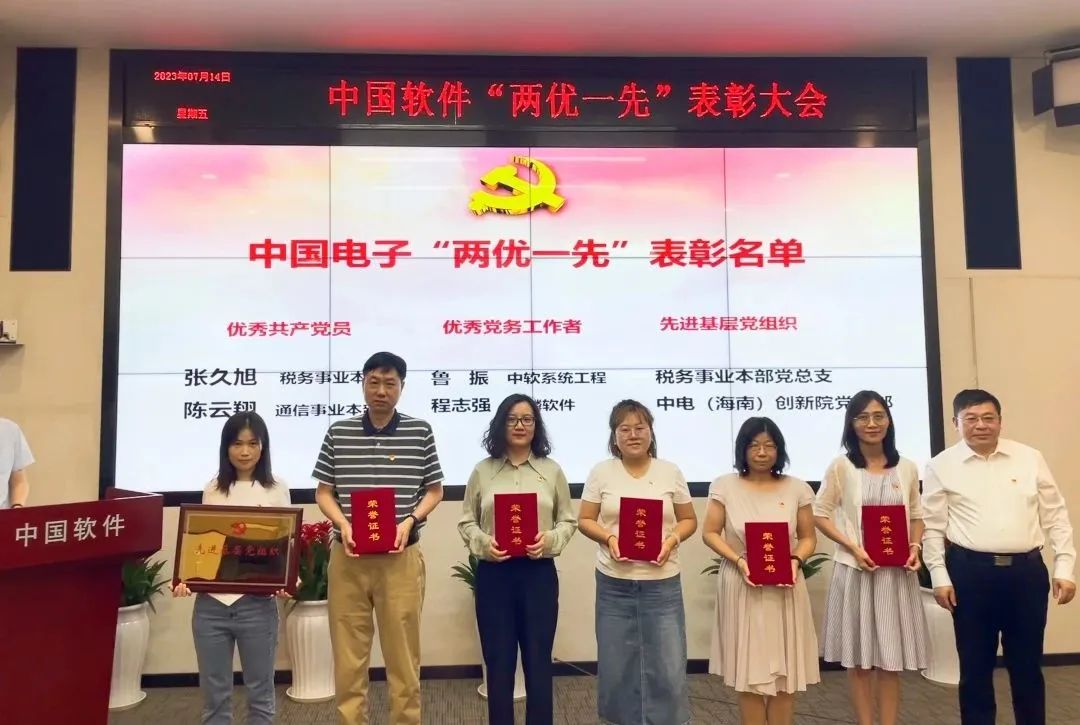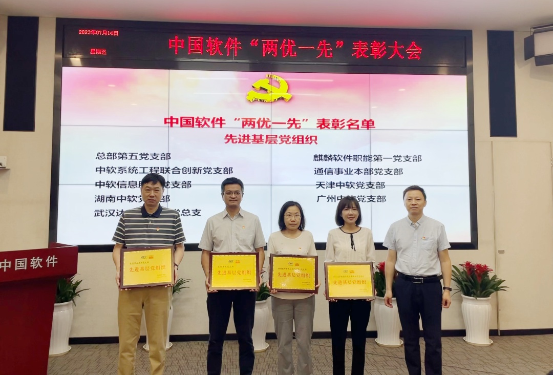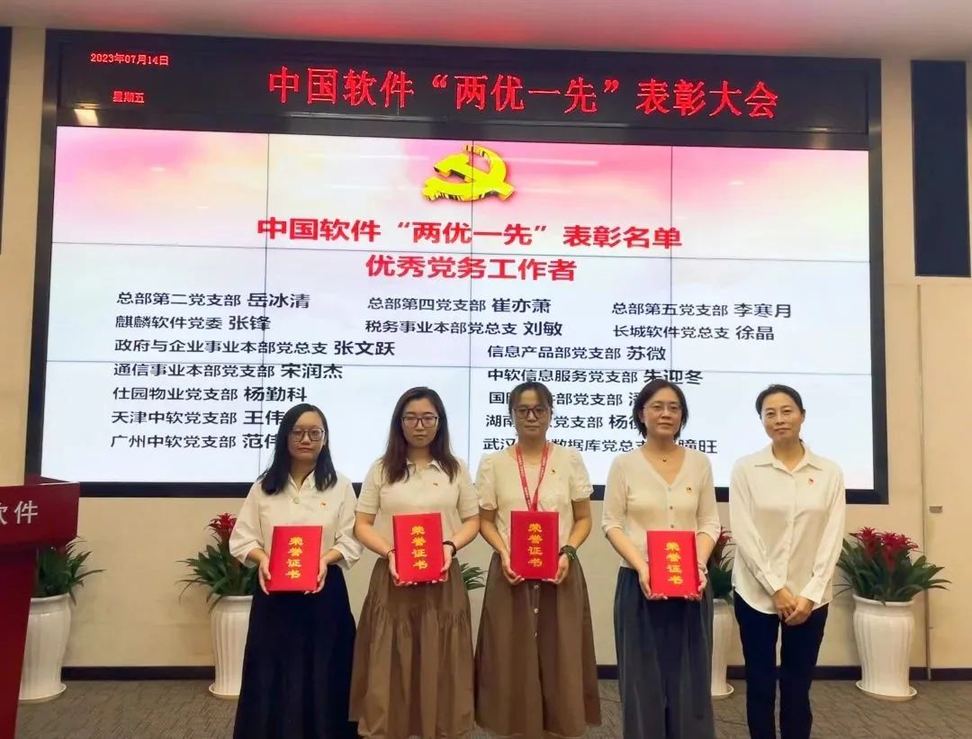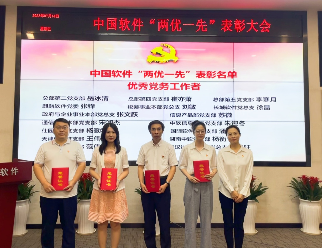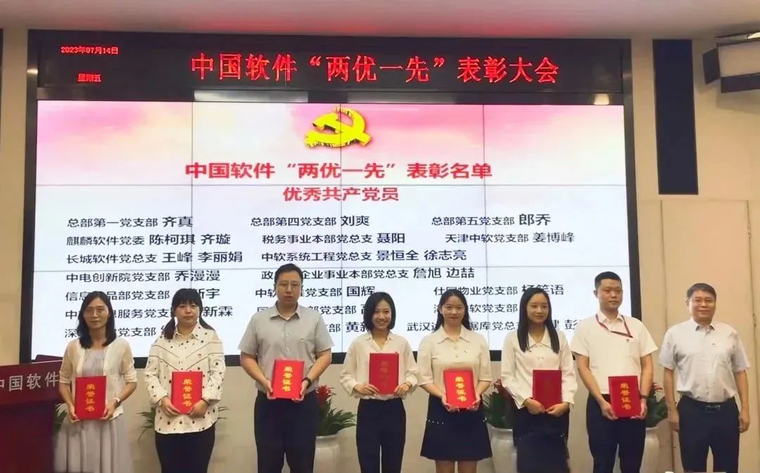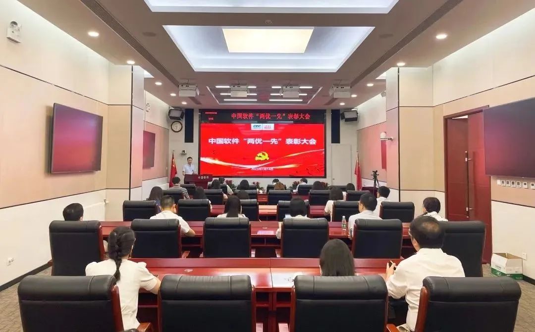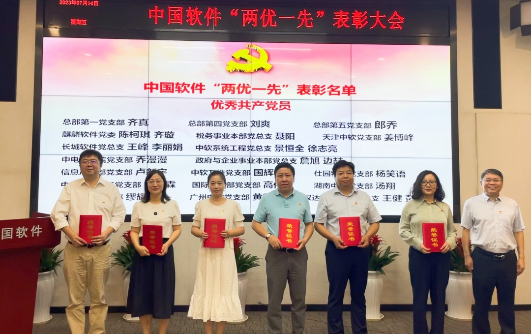 9个先进基层党组织、24名优秀共产党员、16名优秀党务工作者获得中国软件党委表彰。公司领导为“两优一先”代表颁授奖牌。