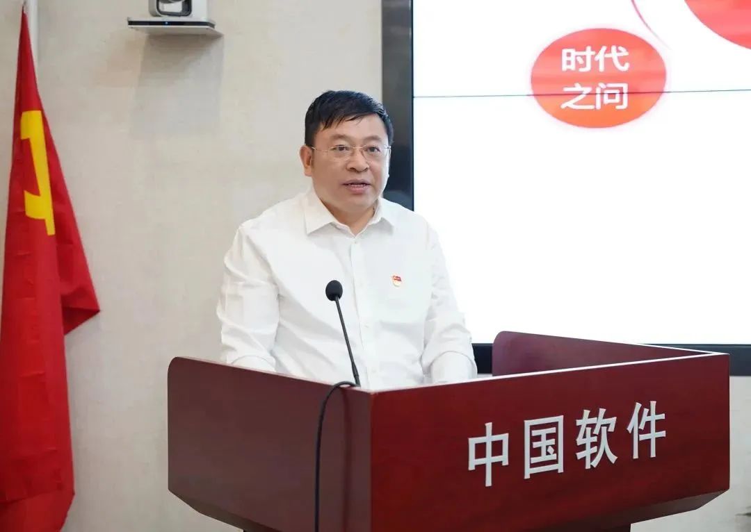 按照主题教育安排,谌志华以《学习贯彻习近平新时代中国特色社会主义思想加速推动中国软件高质量发展》为题,讲授专题党课。