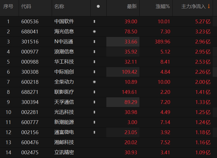 14只个股主力资金净流入超1亿元 中国软件净流入超5亿元居首