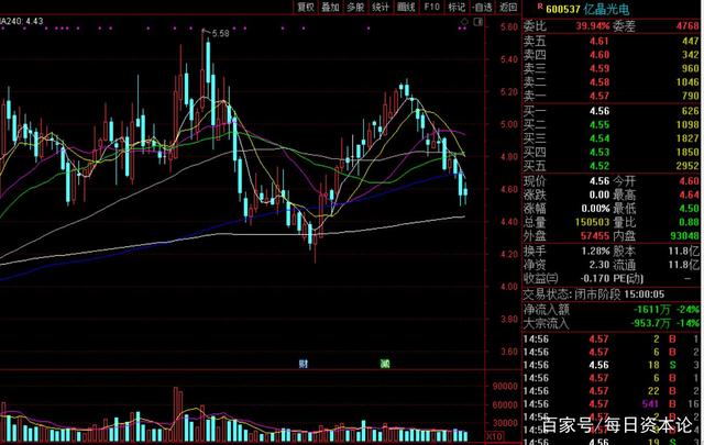 12月8日,亿晶光电科技股份有限公司(下称亿晶光电)股价小幅高开后,呈现震荡走势。截至当日收盘,其股价为4.56元,与上个交易日收盘价持平,总市值53.64亿元。
