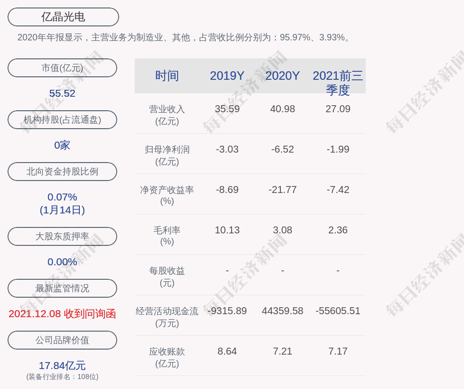 2020年年报显示,亿晶光电的主营业务为制造业、其他,占营收比例分别为:95.97%、3.93%。
