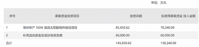 2022年2月,公司发行定增预案,拟定向募资13.02亿元。其中7亿元用于建设常州年产5GW高效太阳能组件项目。规格将亦为210mm及以下尺寸。同年3月已用自有资金投建该光伏组件项目,截至2022年6月末,厂房已经封顶并陆续安排设备进场进行安装调试,彼时公司预计2022年9月达产。