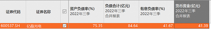 2022年三季度,公司资产负债率达75.35%,负债合计84.64亿,同比增102%。亿晶光电的货币资金有41.39亿元,同比增长127%。
