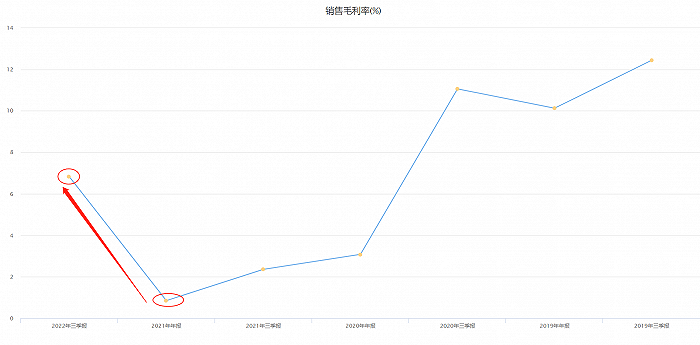 可以看到的是,公司2021年毛利率为0.85%,2022年三季末毛利率一跃跳至6.83%。