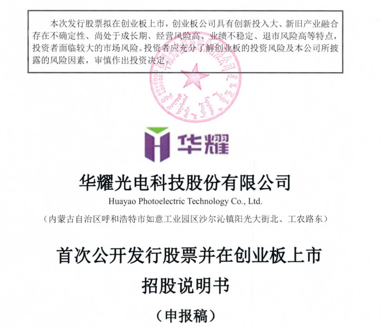 近期,成立不到4年的华耀光电向创业板递交了招股书并获受理,银河证券为保荐机构,目前已经历第一轮问询。