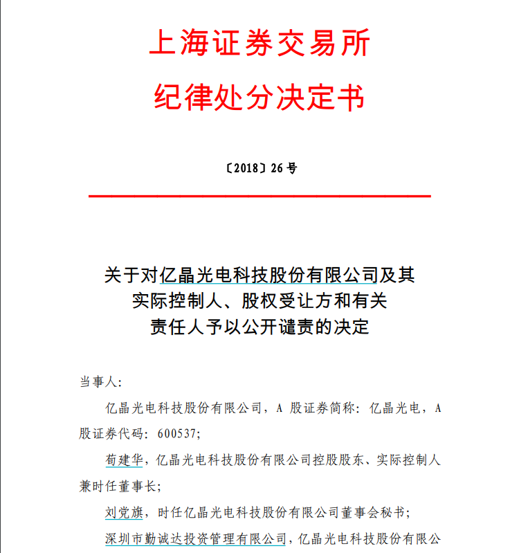 2017年,亿晶光电因未及时披露董事、监事、总经理调整变更等其他涉及控制权转移的重大事项安排被证监会下发处罚决定,证监会对亿晶光电责令改正并罚款60万元,对荀建华给予警告、罚款30万元。2018年,上海证券交易所对亿晶光电股权转让双方隐瞒控制权转让事项给予公开谴责。当时,上交所还将该事项通报了证监会和浙江省政府,并记入上市公司诚信档案。