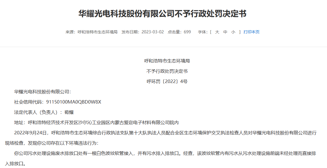 根据呼和浩特市生态环境局于今年3月2日发布的《华耀光电科技股份有限公司不予行政处罚决定书》,2022年9月24日,呼和浩特市生态环境综合行政执法支队第十大队执法人员配合全区生态环境保护交叉执法检查人员对华耀光电科技股份有限公司进行现场检查,发现公司污水处理设施废水排放口处有一根白色波纹软管接入,并有污水排入排放口。经查,该波纹软管内有污水从污水处理设施前端未经处理而直接排入排放口。