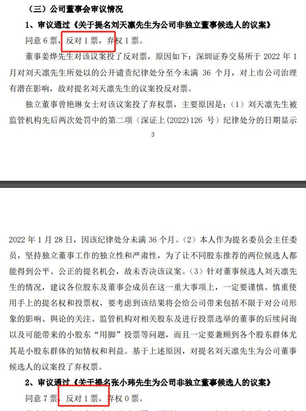 董事姜烨对该议案投了反对票,原因如下:深圳证券交易所于2022年1月对刘天凛所处以的公开谴责纪律处分至今未满36个月,对上市公司治理有潜在影响,故对提名刘天凛的议案投反对票。
