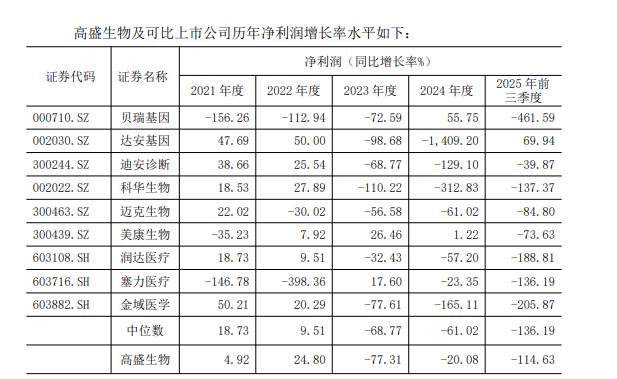 对此,国发股份解释称,这主要受客户预算经费大幅缩减、中标项目减少等因素影响。同时,通过与贝瑞基因(000710)等9家同行业上市公司对比,上市公司分析称,业内公司业绩在2023年至2025年均明显下降,高盛生物的业绩下滑与行业趋势基本一致。