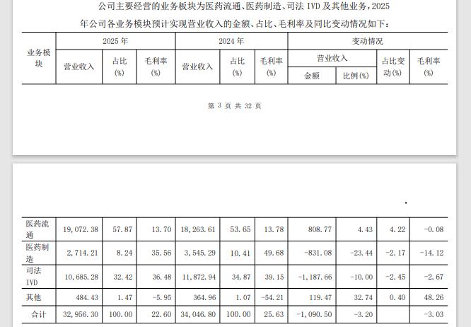 关于营业收入扣除情况,国发股份回复称,公司2025年预计营收约3.3亿元,扣除与主营业务无关的收入248.08万元后,营收为3.27亿元。分业务看,医药流通业务收入占比近58%,同比增长4.43%;而司法IVD与医药制造业务收入分别下降10%和23.44%。