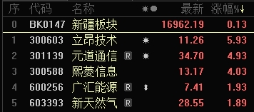 11月7日新疆板块股价涨幅前5位(来自东方财富)。
