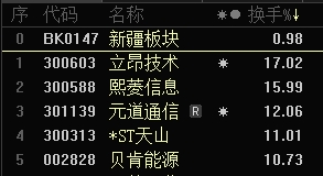 11月7日新疆板块换手率前5位(来自东方财富)。