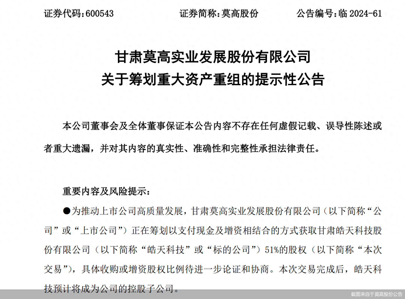 消息面上,8月28日晚间,莫高股份发布公告称,公司正在筹划以支付现金及增资相结合的方式获取皓天科技51%的股权,具体收购或增资股权比例待进一步论证和协商。本次交易完成后,皓天科技预计将成为公司的控股子公司。
