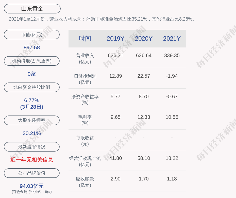 2021年1至12月份,山东黄金的营业收入构成为:外购非标准金冶炼占比35.21%,其他行业占比8.28%。