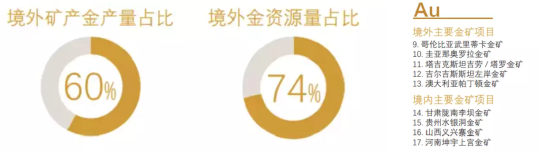 以现有资源储量统计,紫金矿业海外金矿产资源量及产量均全面超越国内,其中,紫金矿业海外金矿产量占比约为60%,资源量占比更是高达到74%。