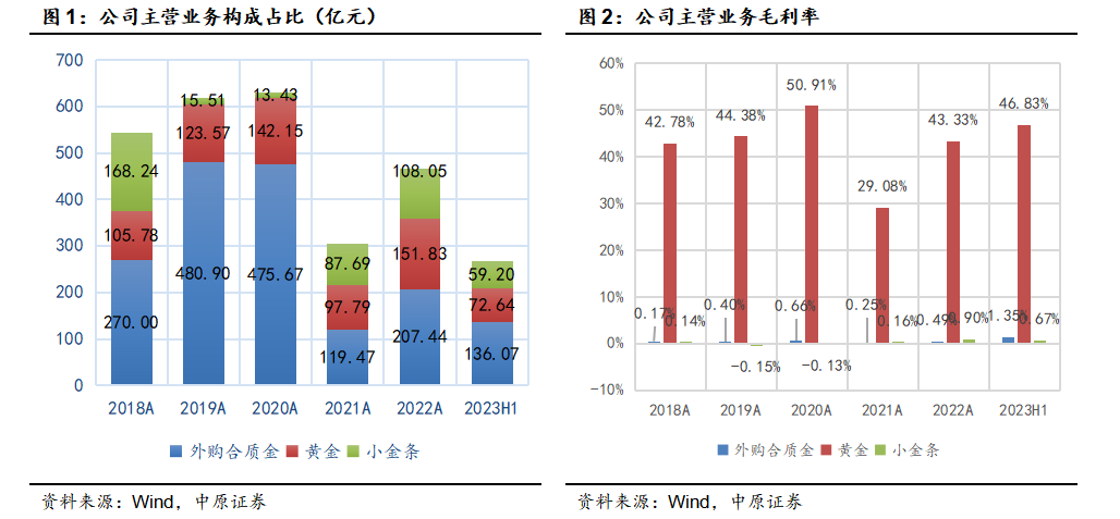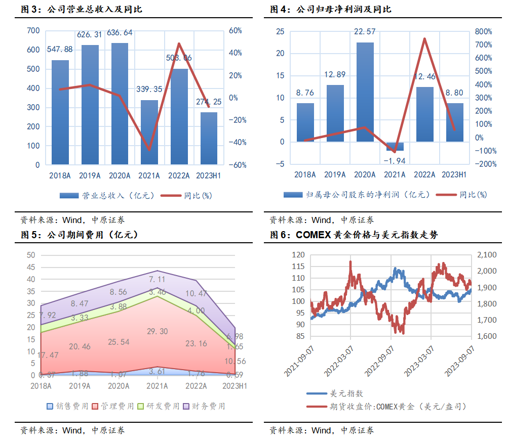 受到金价高位运行等因素影响,公司主营业务盈利水平提升。2023年上半年,COMEX黄金和SHFE黄金价格维持高位震荡上行,价格分别上涨5.58%/9.78%。分业务来看,2023年H1公司主营业务中,外购合质金/黄金/小金条营业收入分别为136.07/72.64/59.20亿元,分别同比增长-4.32%/-8.23%/88.77%;毛利分别为1.84/34.02/0.4亿元,分别同比增长181.46%/-5.86%/512.35%;毛利率分别为1.35%/46.83%/0.67%,相较上年同期分别增加0.89%/1.18%/0.46%。公司期间费用管控良好,2023年上半年公司销售费用/管理费用/财务费用分别为0.59/10.56/6.98亿元,分别同比增长-41.38%/-32.92%/39.83%。
