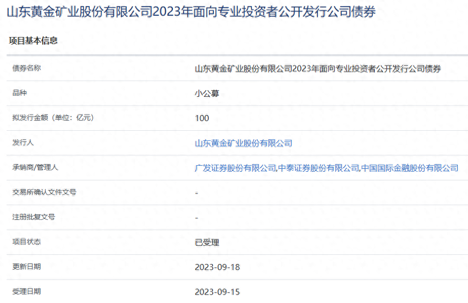 山东黄金矿业股份有限公司(证券简称:山东黄金,证券代码:600547.SH)2023年面向专业投资者公开发行公司债券项目,目前的项目状态为“已受理”,更新日期为9月18日,受理日期为9月15日。
