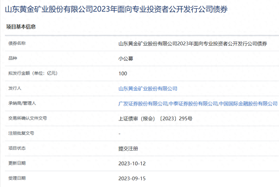 山东黄金矿业股份有限公司(下称“山东黄金”)2023年面向专业投资者公开发行公司债券项目,目前的项目状态为“提交注册”,更新日期为10月12日,项目受理日期为9月15日。