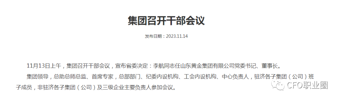 2023年11月13日上午,山东黄金集团召开干部会议,宣布省委决定:李航同志任山东黄金集团有限公司党委书记、董事长。
