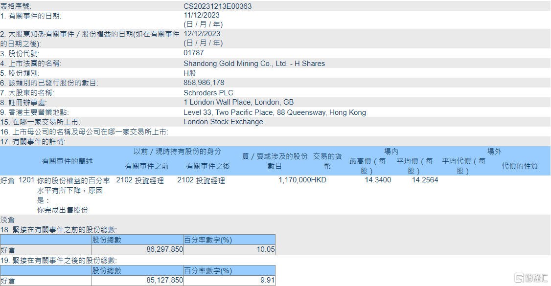 12月15日丨根据联交所最新权益披露资料显示,2023年12月11日,山东黄金(01787.HK)遭Schroders PLC在场内以每股均价14.2564港元减持117万股,涉资约1668万港元。