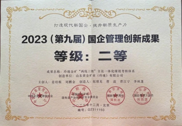 近日,2023年(第九届)国企管理年会暨国企管理创新成果发布仪式在北京会议中心召开。山东黄金玲珑金矿申报的《“两线三级”全员一体化绩效考核体系》从4110项成果中脱颖而出,喜获二等奖,成为全国矿山行业绩效考核创新案例唯一获奖成果。
