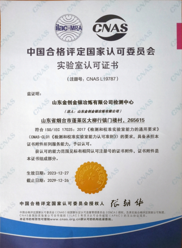 近日,山东黄金所属金创冶炼检测中心获得由中国合格评定国家认可委员会颁发的“CNAS实验室认可证书”。这标志着金创冶炼检测中心具有了国家及国际认可的管理水平和检测能力,认可范围内“金精矿金银铅锌铜量的测定”可以使用CNAS国家实验室认可标志。至此,山东黄金获CANS认证企业增至2家。