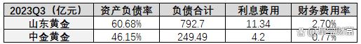 并购需要资金。截至2023年三季度末,中金黄金资产负债率46.15%,负债合计249.49亿。而山东黄金资产负债率已达60.68%,负债合计792.70亿。