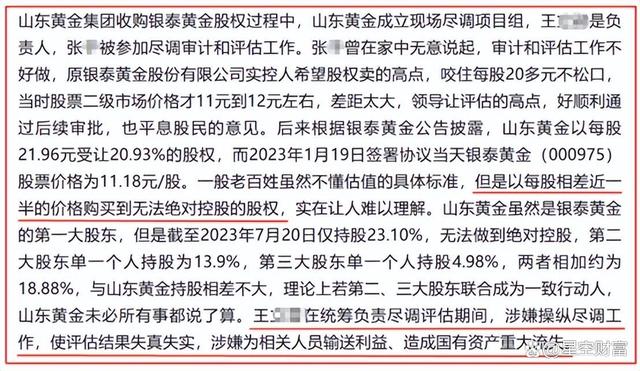 此前的桃色丑闻举报信中,也曾提及了此事。信中说,银泰黄金原实控人坚持要高价卖出不松口,而山东黄金的领导也让评估的高点,方便通过后续审批。