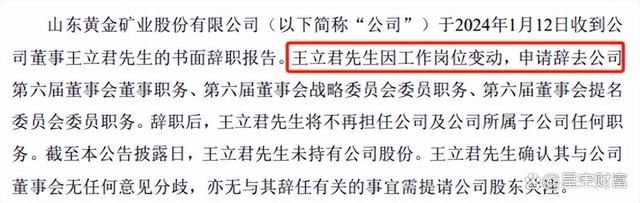 1月15号,山东黄金(600547)发布了一条看似不太起眼的公告:董事王立君先生因工作岗位变动,申请辞职。