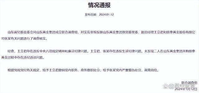 去年11月,曾有网友实名举报,山东黄金集团有限公司党委常委、副总经理王某,与其妻子——山东黄金派驻银泰黄金股份有限公司的财务总监张某,“自2011年起就长期存在不正当性关系,张某2013年、2019年两次为王某流产,2021年还曾感染HPV16+”。
