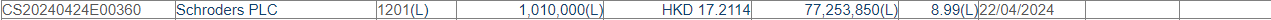 根据联交所最新权益披露资料显示,2024年4月22日,山东黄金(01787.HK)遭Schroders PLC在场内以每股均价17.2114港元减持101万股,涉资约1738.35万港元。