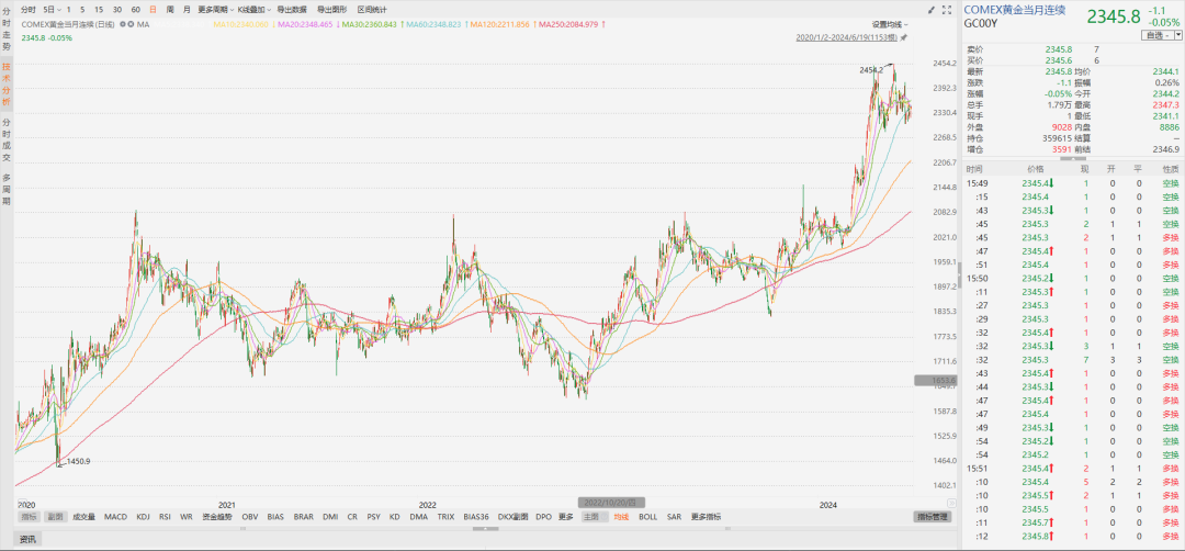 2023年初至今,COMEX黄金期货价格上涨超过27%,这还是近期有所回调后的累计涨幅,此前价格甚至一度超过2450美金/盎司,近期则在2300多美金/盎司的价格徘徊。如果从2020年初本轮黄金牛市的起点初期开始统计,至今的累计涨幅已超50%。