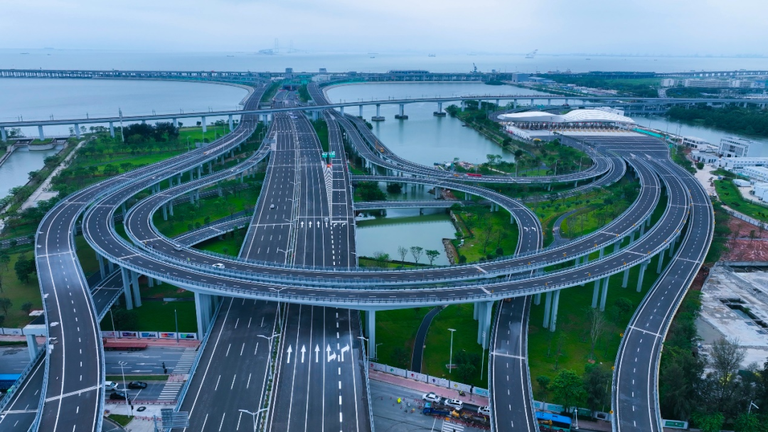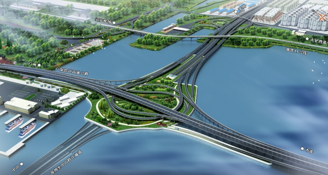 机场复合式互通立交如同榫卯一般,将深中通道、宝安国际机场以及沿江高速一期紧密联系在一起。