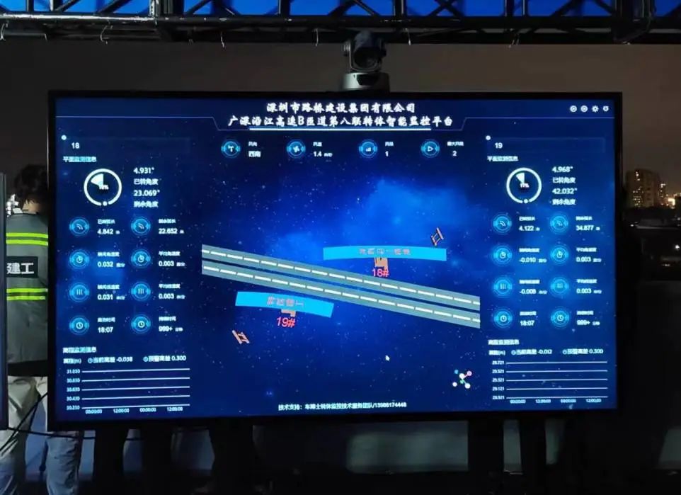第八联单个桥墩上部钢箱梁转体最大重量约2900吨,启动时存在偏心不平衡情况。深高速为确保安全平衡转体,设计以每分钟1.1°的速度平稳运动,在转体过程中实时监测风速、风向、转速和梁体空间姿态,转体合龙口相对高差及轴线偏差控制在毫米级。