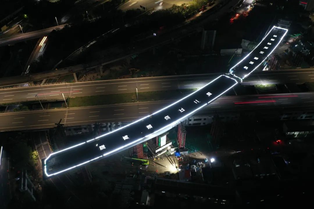 2024年4月28日夜,仅历时42分钟,沿江高速二期鹤州互通B匝道第八联连续钢箱梁在第18号墩、19号墩同时完成潇洒“转身”后成功合龙。