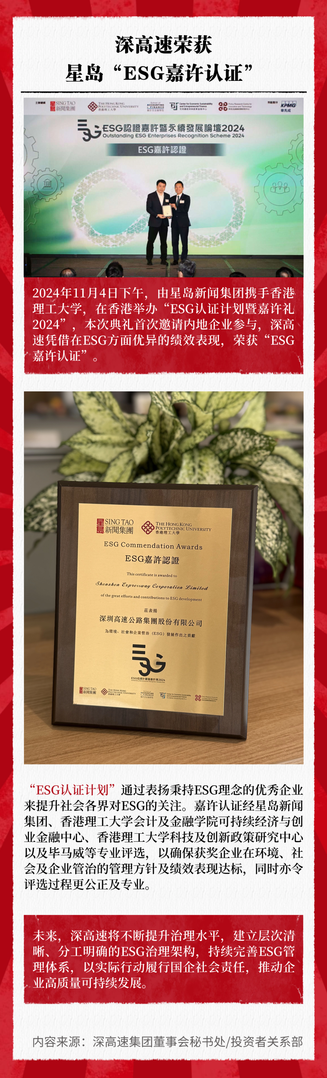 荣誉捷报 | 深高速荣获星岛“ESG嘉许认证”