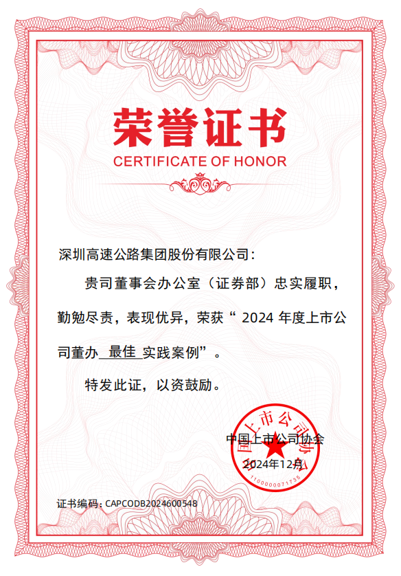 近日,由中国上市公司协会(“中上协”)主办的2024年“上市公司董办最佳实践案例征集活动”结果已揭晓,深高速荣获“2024上市公司董办最佳实践案例”。