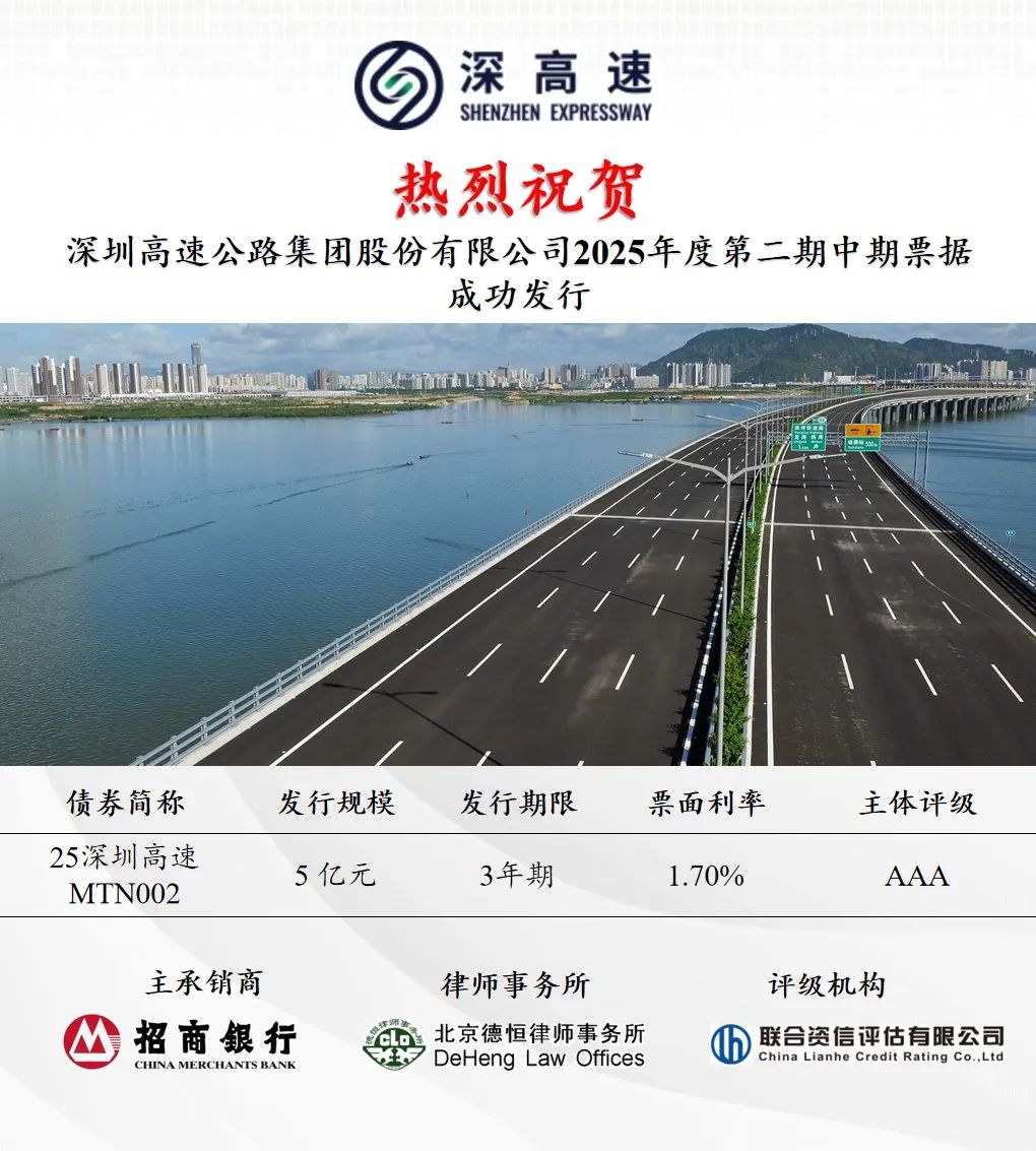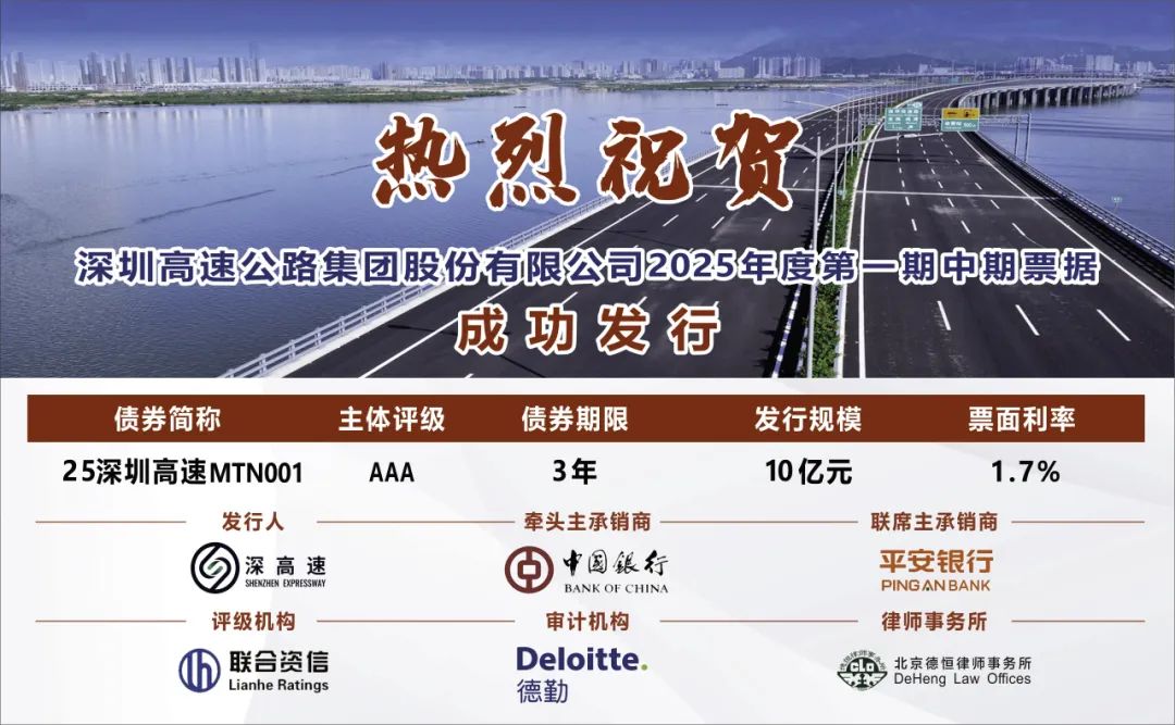 近日,深高速成功发行2025年第一期、第二期中期票据,发行规模共15亿元,期限均为3年,主体评级AAA,票面利率均为1.70%,创全国同评级地方国企及中央企业发行同期限中期票据新低,较近一个月全国同评级地方国企及中央企业所发行的同期限中期票据平均水平低约17%。