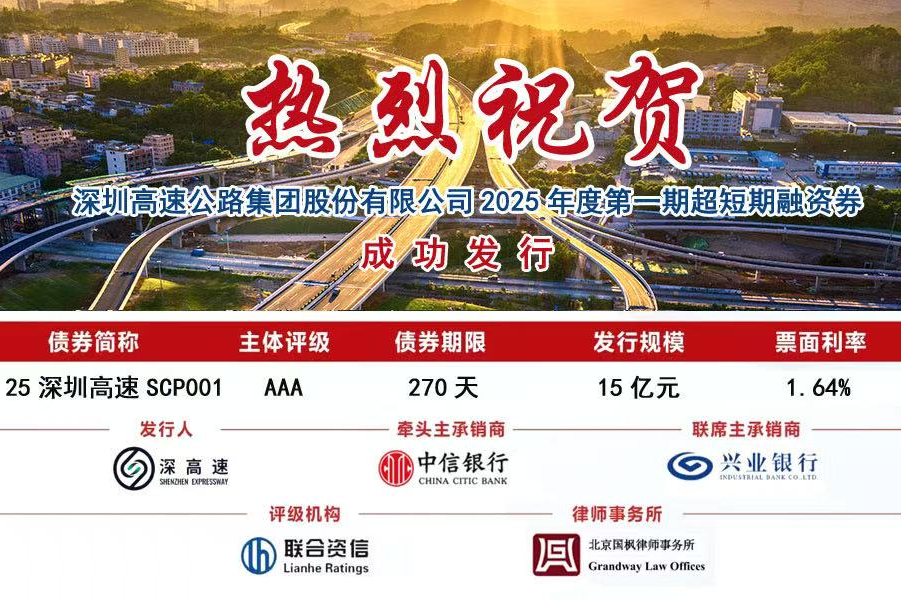 4月15日,深高速成功发行2025年度第一期超短期融资券,发行规模共15亿元,期限270天,主体评级AAA,票面利率1.64%,创深圳市同评级各类企业(含驻深央企、市属国企、民营企业等)发行同期限超短融新低。