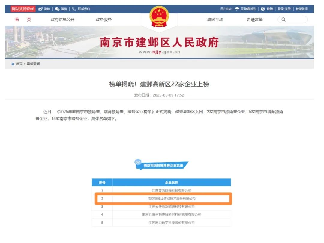 近日,2025年度南京市独角兽、培育独角兽、瞪羚企业榜单正式揭晓。深高速集团所投资企业南京安维士传动技术股份有限公司凭借高速成长与创新能力,继去年荣获国家级专精特新“小巨人”企业称号后,再次成功入选2025年度南京市“培育独角兽”企业榜单。