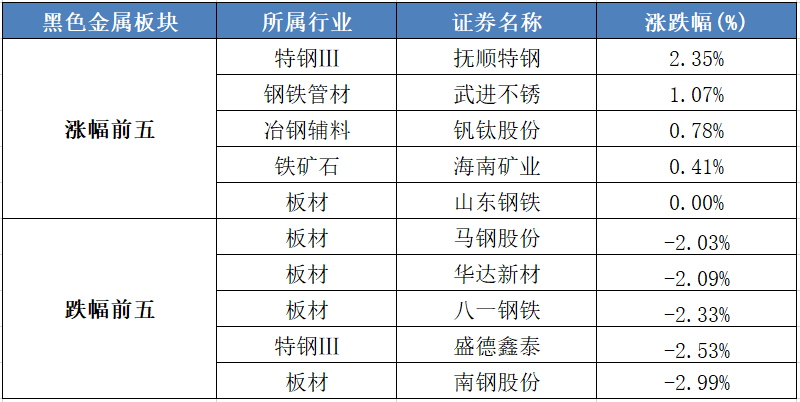 12月14日,沪深300上涨0.23%,黑色金属板块中冶钢原料、特钢Ⅱ和普钢涨幅分别为-0.27%、-0.41%和-1.40%,均跑输大盘。黑色金属板块涨幅前五的公司有抚顺特钢(2.35%)、武进不锈(1.07%)、钒钛股份(0.78%)、海南矿业(0.41%)和山东钢铁(0.00%);跌幅前五的公司分别是马钢股份(-2.03%)、华达新材(-2.09%)、八一钢铁(-2.33%)、盛德鑫泰(-2.53%)和南钢股份(-2.99%)。