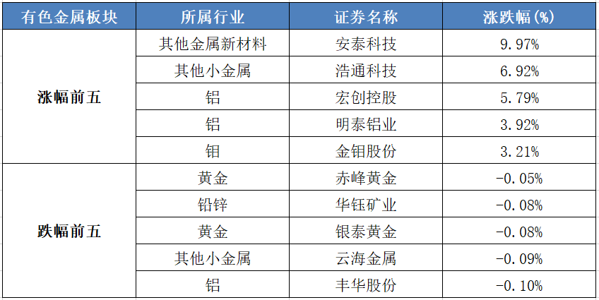 有色金属板块中仅工业金属、贵金属跑赢大盘,涨幅为0.63%和0.28%,而金属新材料、小金属和能源金属涨幅分别为0.12%、-0.45%和0.70%。有色金属板块中涨幅前五的公司有安泰科技(9.97%)、浩通科技(6.92%)、宏创控股(5.79%)、明泰铝业(3.92%)和金钼股份(3.21%);跌幅前五的公司分别是赤峰黄金(-0.05%)、华钰矿业(-0.08%)、银泰黄金(-0.08%)、云海金属(-0.09%)和丰华股份(-0.10%)。