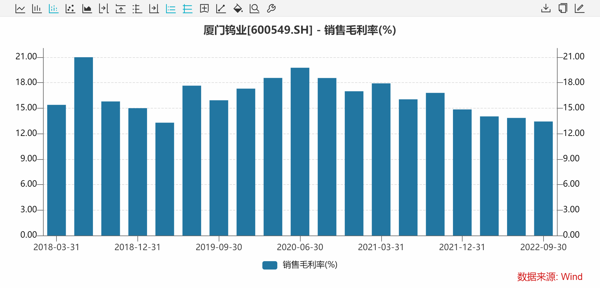 数据显示,以单季度的毛利率衡量,厦门钨业2022年前三个季度毛利率处于下滑趋势中。